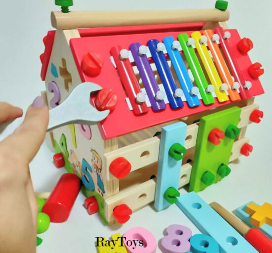 Aceasta casuta de joacă din lemn  viu colorata are  activități care vă vor ține copilul ocupat ore întregi! Fiecare parte are o caracteristică diferită.
