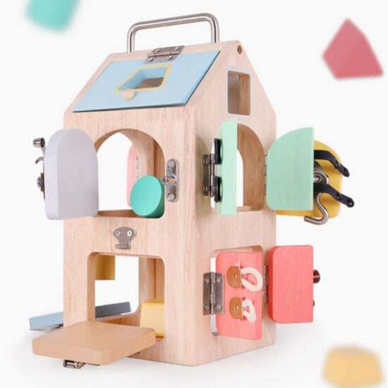 Tabla Montessori Activitati multiple educative Tabla de scris5Casuta Montessori este o jucarie educativa 2 in 1,sortator forme geometrice si invatam sa incuiem-descuiem usile si lacatele. Fiecare parte laterala are cate o activitate educativa si de indemanare.