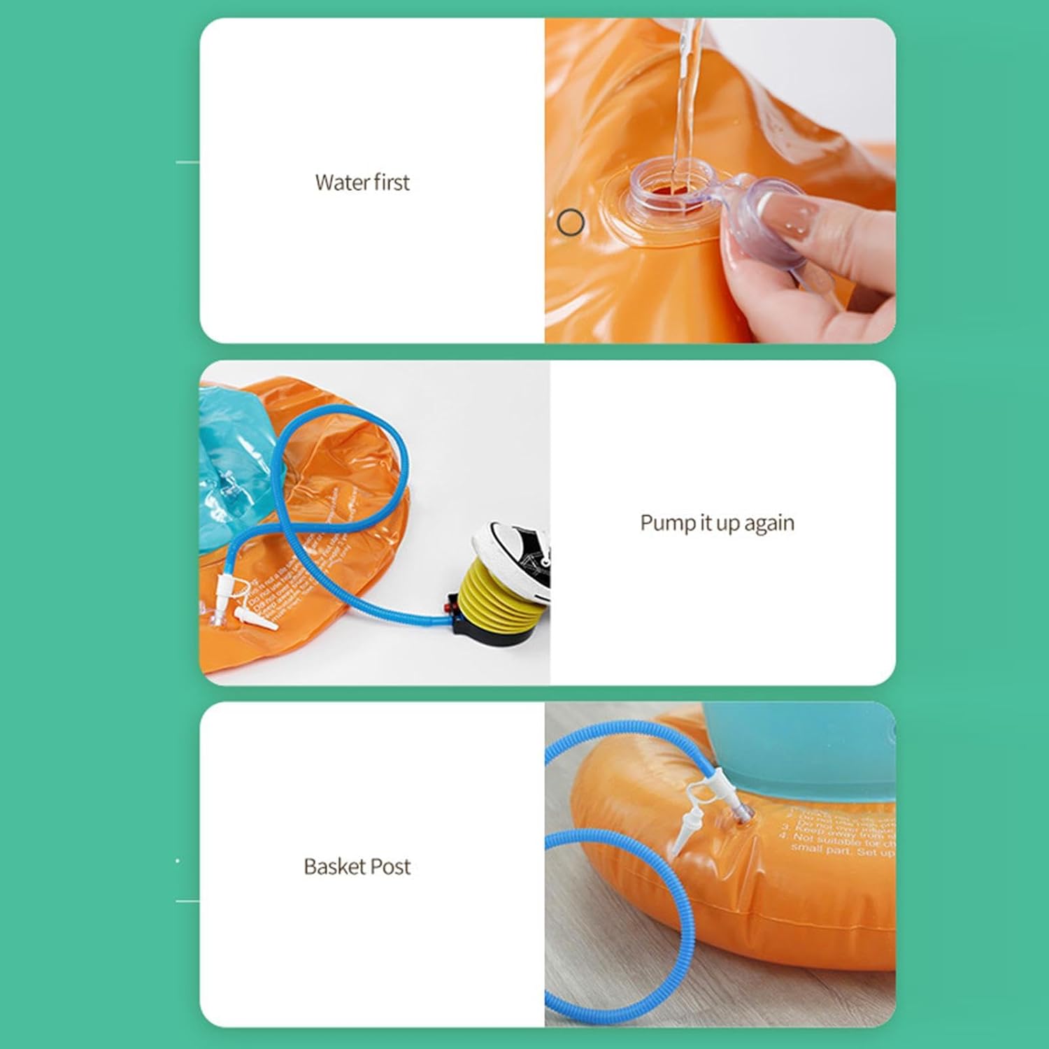 - Mai întâi, turnați apă în partea de jos a cadrului de baschet pentru a o menține stabilă și a nu se clatina. Apoi, umflați mingea si restul cadrului de baschet.
