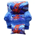 Un fotoliu extensibil pentru copii, decorat cu tema personajului Spiderman, un erou popular din benzile desenate si filme. Fotoliul este de culoare albastra si are imprimate imagini vibrante cu Spiderman in diferite pozitii caracteristice, de parca ar sari sau ar zbura prin aer.