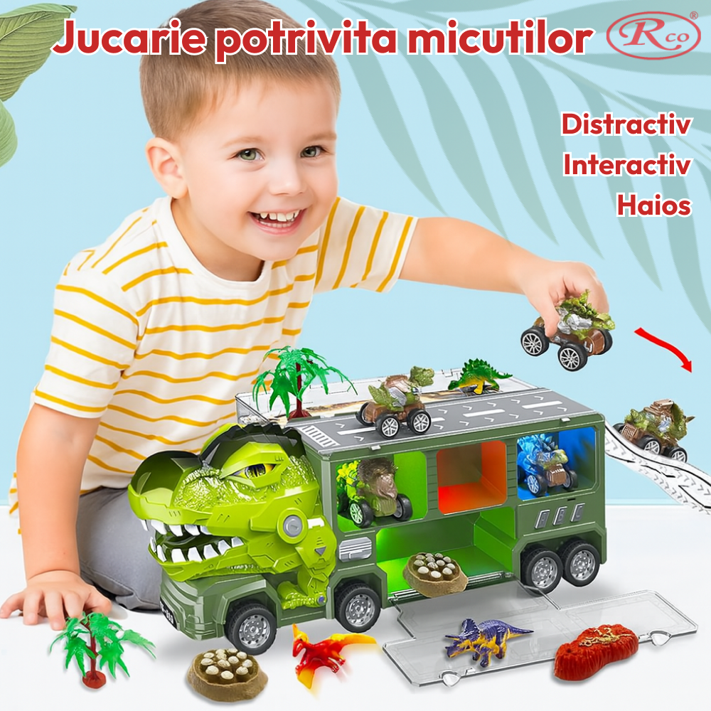 - Camionul T-Rex rabatabil vine echipat cu efecte luminoase si sonore care transforma fiecare joaca intr-o aventura autentica: claxon realist, sunete de motor si ragete de dinozaur care captiveaza si surprind.