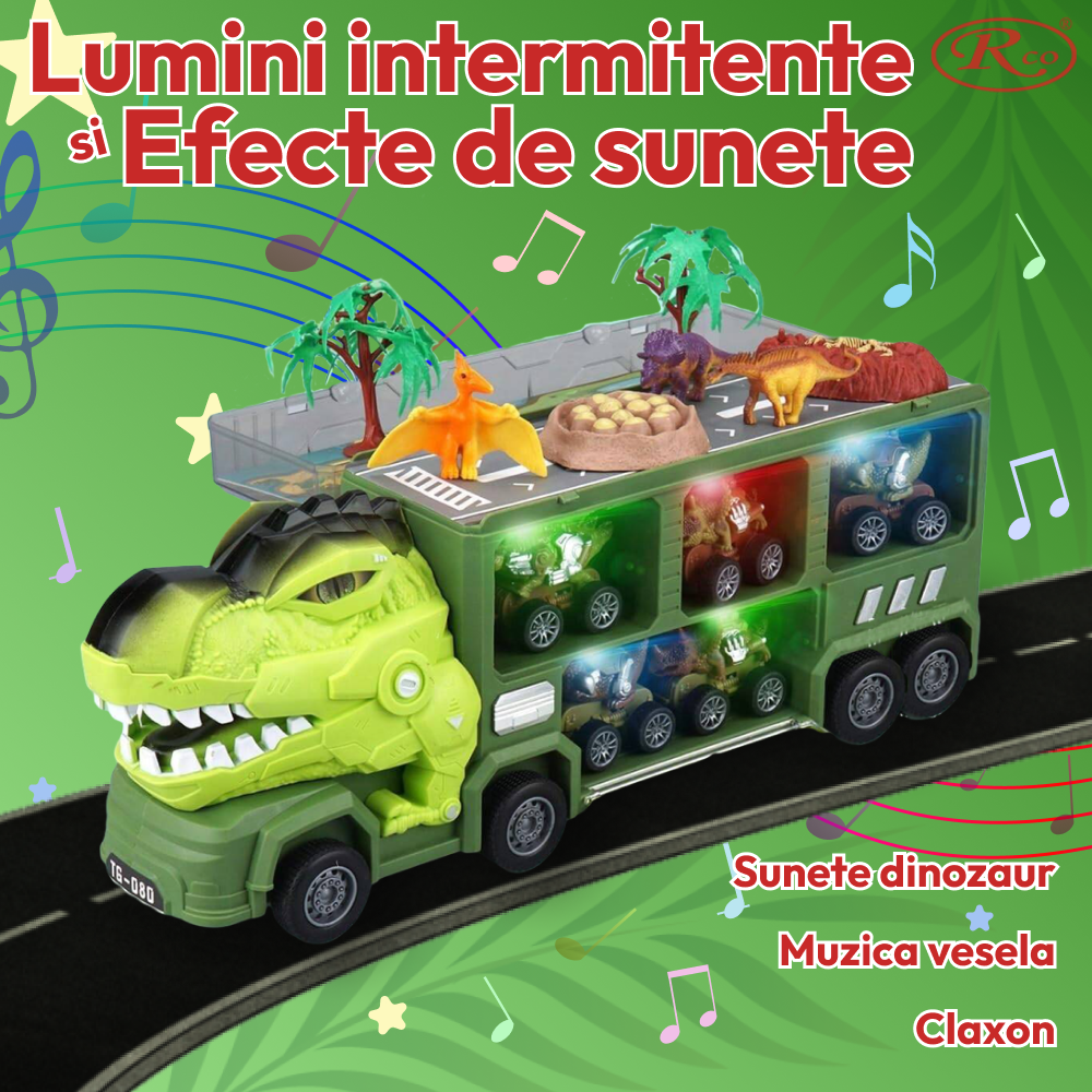 O jucărie tip camion transportator cu tematică dinozauri, creată special pentru copii pasionați de dinozauri și vehicule. Set 7 in 1 Camion T-Rex Trailer – Aventura preistorica cu lumini, sunete si vehicule cu mecanism Pull Back. Camionul are un design spectaculos, cu partea din față în forma unui cap de Tyrannosaurus Rex (T-Rex), având ochi galbeni expresivi și detalii mecanice de tip robotic.