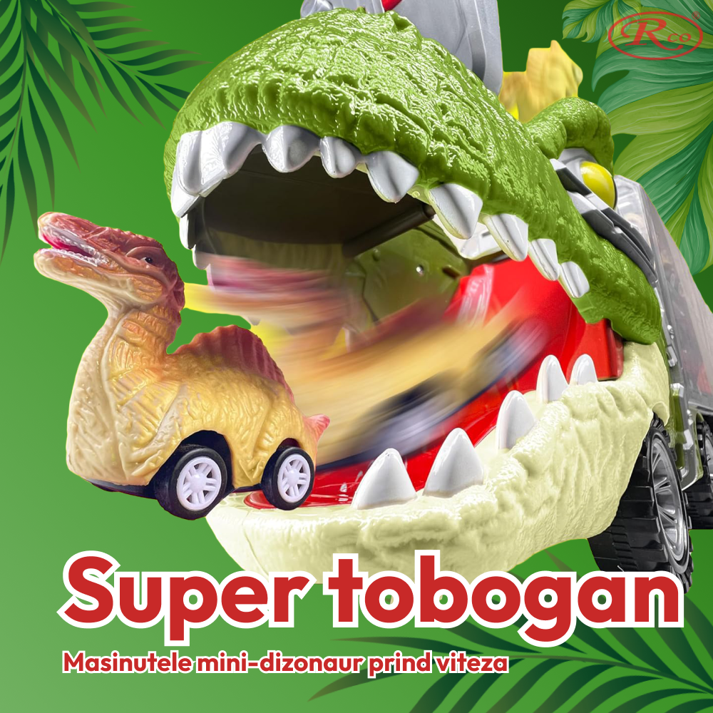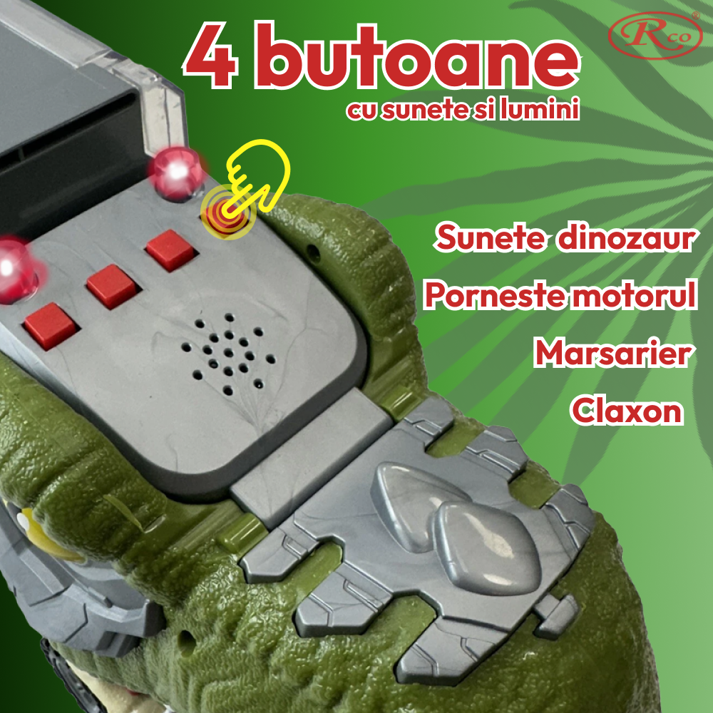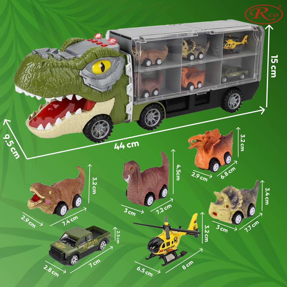 O jucărie tip camion transportator cu tematică dinozauri, creată special pentru copii pasionați de dinozauri și vehicule. Set 7 in 1 Camion T-Rex Trailer RCO® – Aventura preistorica cu lumini, sunete si vehicule cu mecanism Pull Back. Camionul are un design spectaculos, cu partea din față în forma unui cap de Tyrannosaurus Rex (T-Rex), având ochi galbeni expresivi și detalii mecanice de tip robotic.