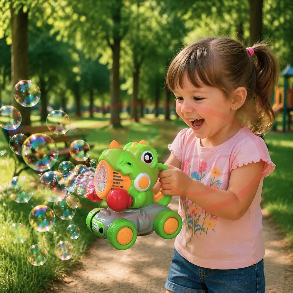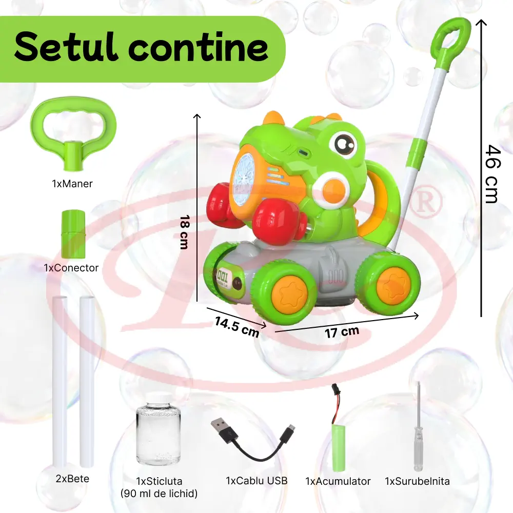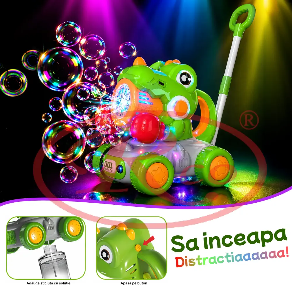 O jucarie 2 in 1 care ii va distra pe copii datorita baloanelor care le emite dinozaurul. O mașinuță de bule cu design de dinozaur, concepută pentru ca copiii să o împingă și să se joace cu ea.