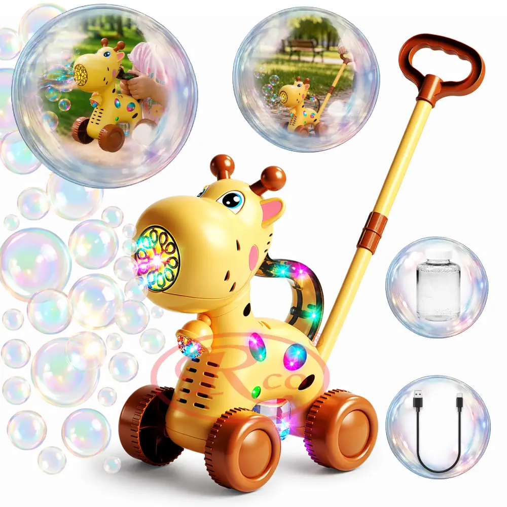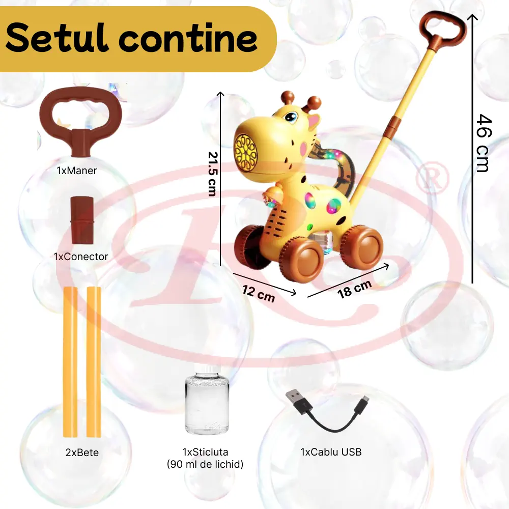 O jucarie 2 in 1 care ii va distra pe copii datorita baloanelor care le emite girafa. O mașinuță de bule cu design de girafa, concepută pentru ca, copiii să o împingă și să se joace cu ea emitand baloanele.