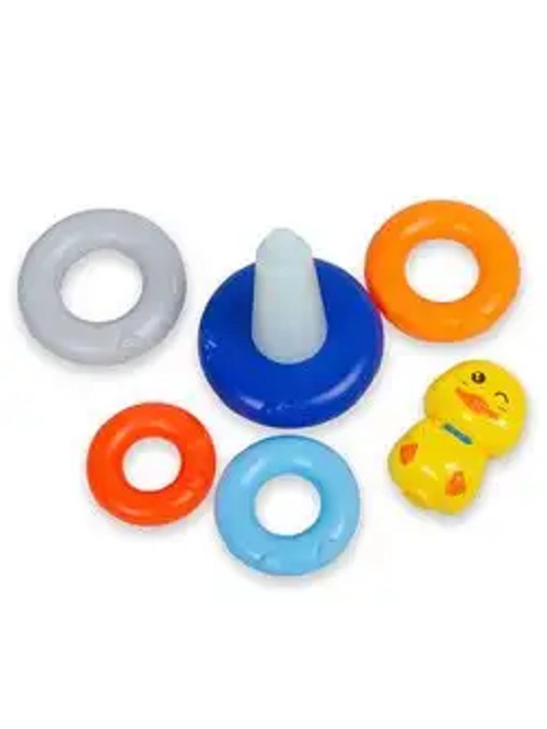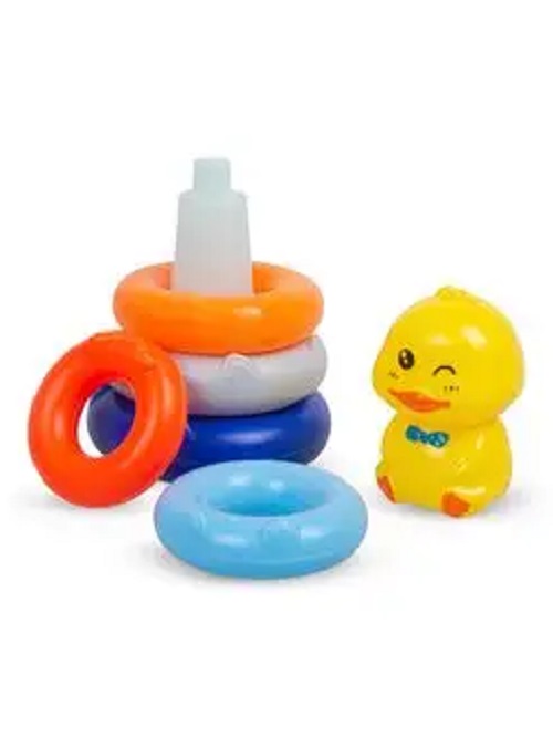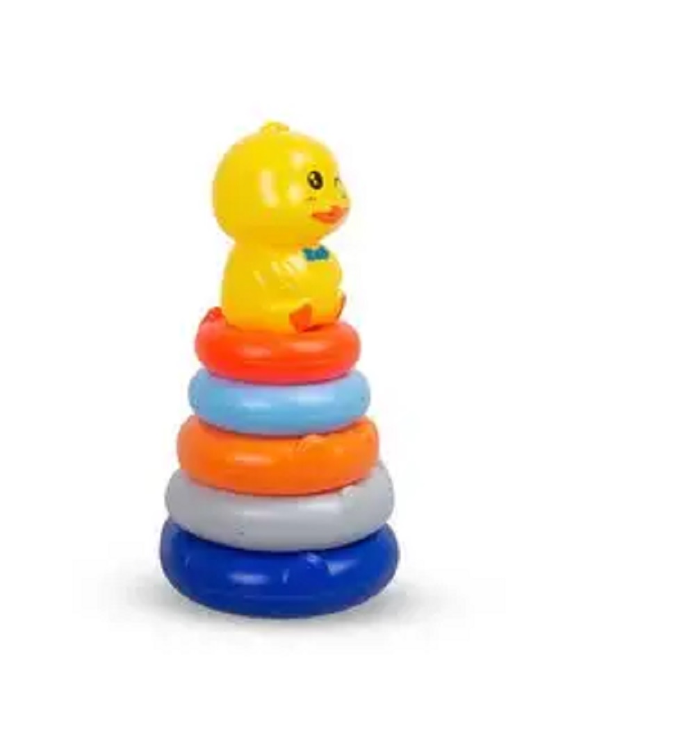 O jucarie educativa pentru bebe colorata frumos cu cercuri de la mic la mare si o ratusca draguta. Jucaria poate fi folosita si la baita,este usor de apucat. Turnul de stivuire este sub forma unei piramide cu cercuri colorate.