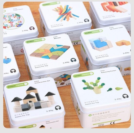 Mini jocuri de constructie creative din lemn pentru calatoriiMini jocuri din lemn in cutiuta metalica,special concepute pentru a calatori cu ele in gentuta dumneavoastra pentru copii. Sunt diferite modele 6 la numar: snuruit,tangram,constructie ,recunoasterea culorilor si puzzle.