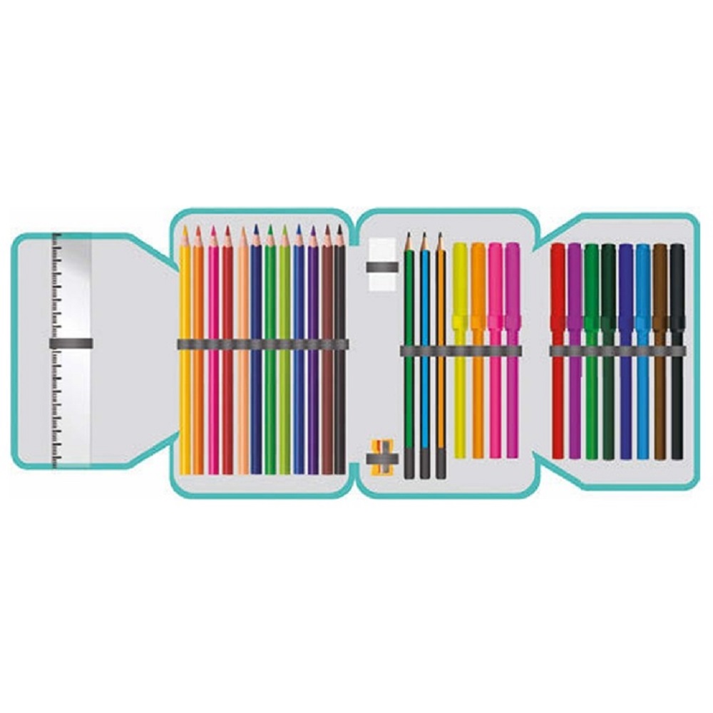 Datorită închiderii puternice cu fermoar și aranjării organizate a accesoriilor, totul este la locul său și pregătit pentru învățare și creativitate. Penarul nu este doar practic – designul său colorat și modern