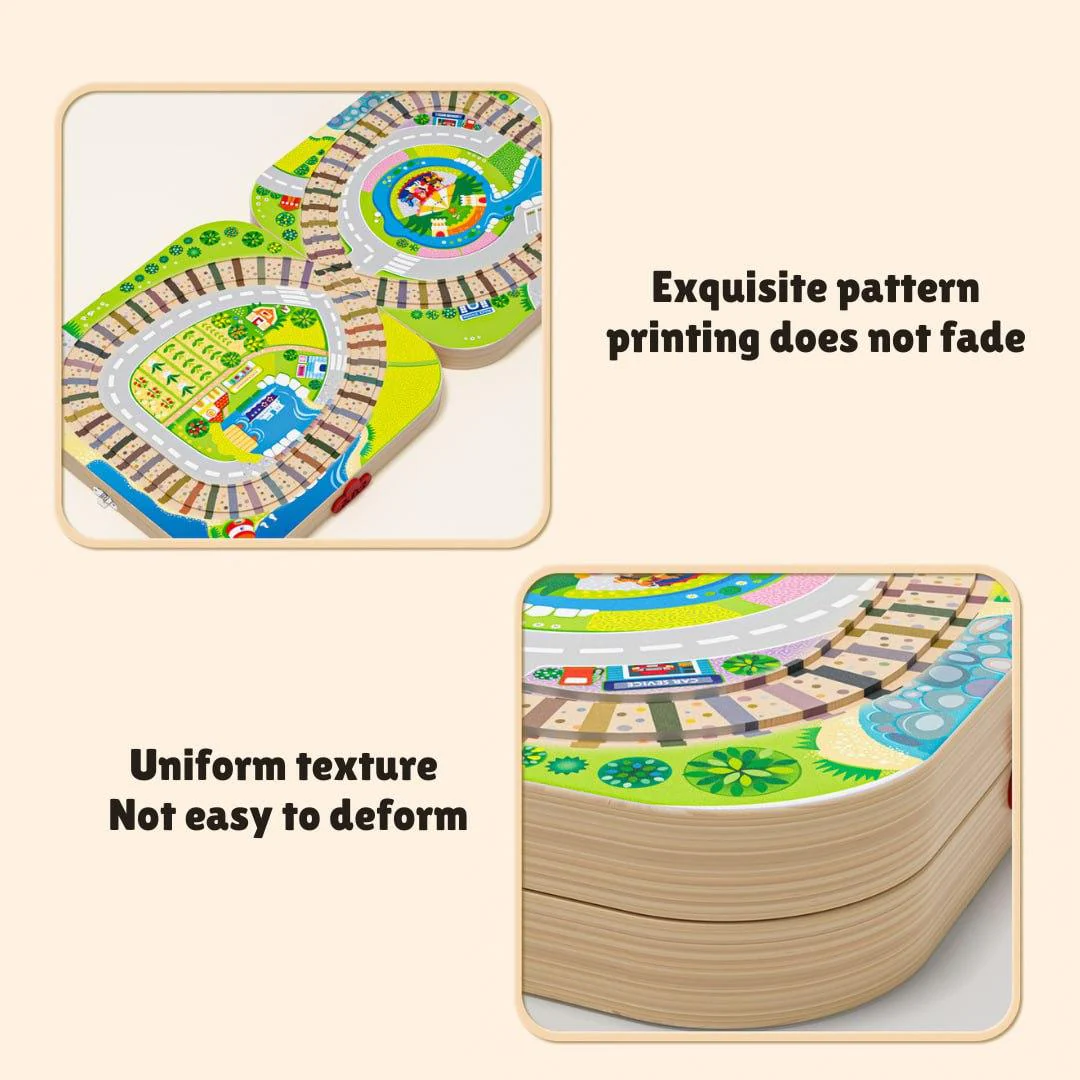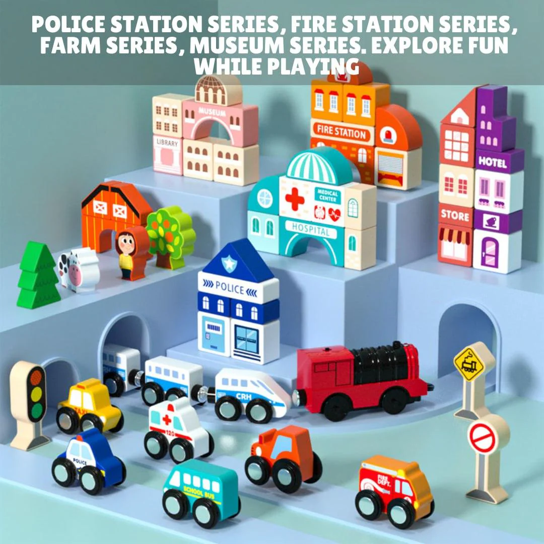 Aceste blocuri educaționale au o multime de elemente care ies in evidenta de alte jucarii din lemn,in culori vii si manopera precisa. Blocurile pot fi folosite pentru a construi un oraș cu numeroase cladiri. Setul de jucării educaționale din lemn „Orașul cu locomotivă” combină învățarea cu joaca, încurajând dezvoltarea naturală a copilului. Conținutul cutiei face din aceasta o jucărie unică, durabilă și funcțională