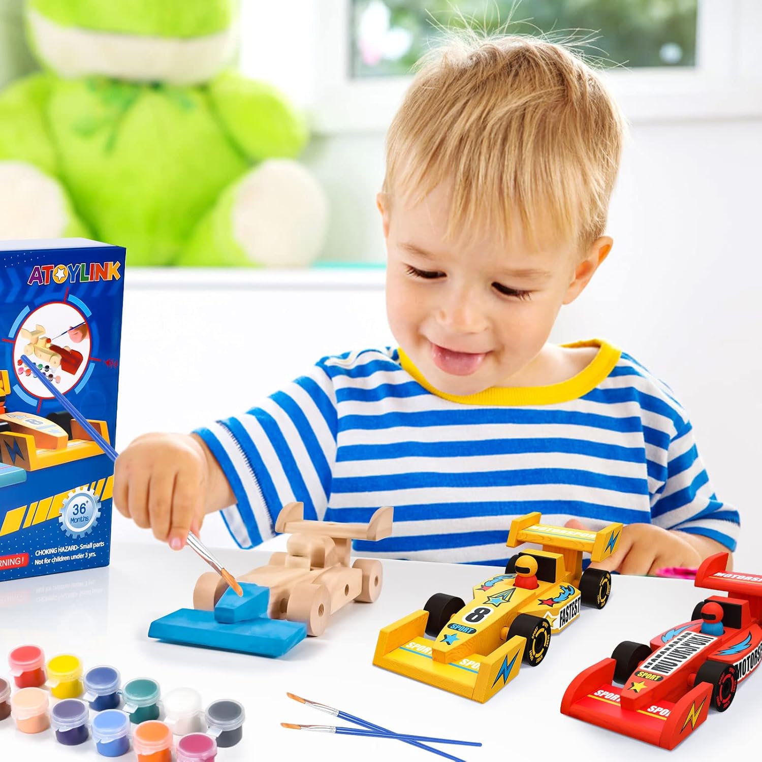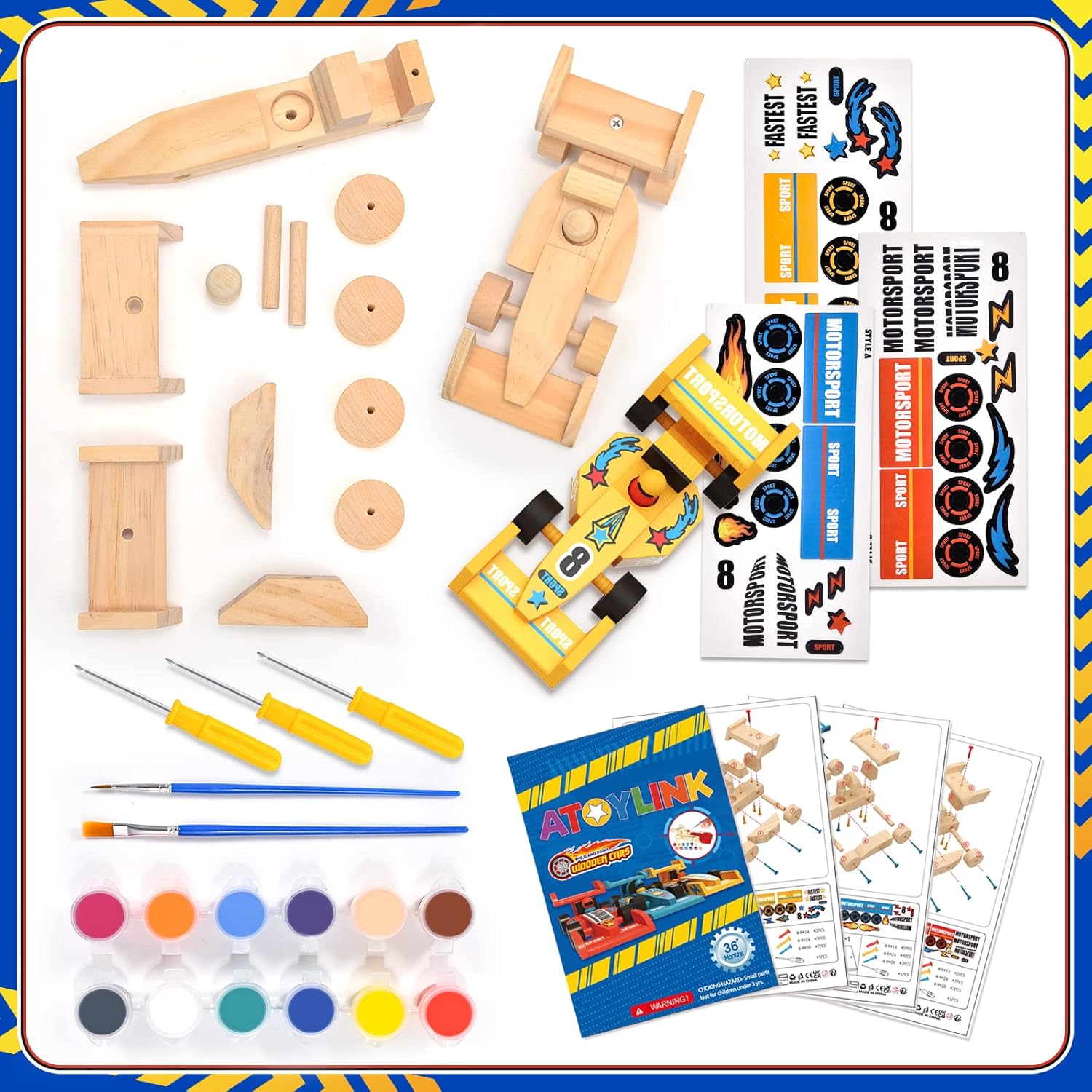 - 3 mașinuțe din lemn (stil Formula 1), neasamblate și nepictate.