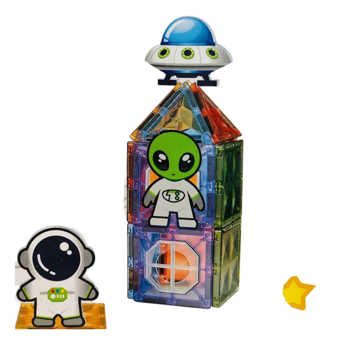 - forme colorate care includ forme geometrice, blocuri magnetice și câteva autocolante distractive cu alfabet, oferind combinații creative infinite