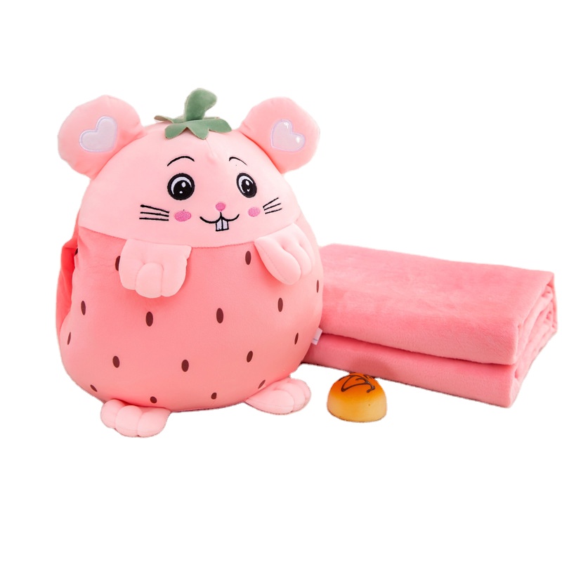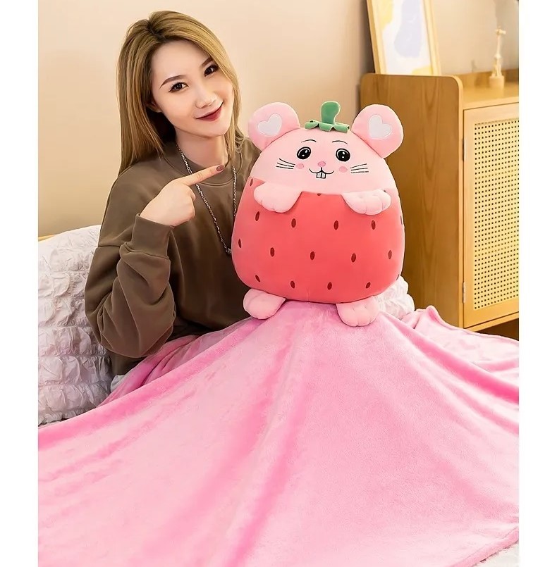 Un set compus din perna sub forma unui fruct capsuna soricel din plus si o paturica moale si catifelata. Designul jucariilor din plus combina elemente traditionale si moderne, cu design si un stil simplificat care ar putea sa le faca atractive pentru copii si parinti deopotriva.