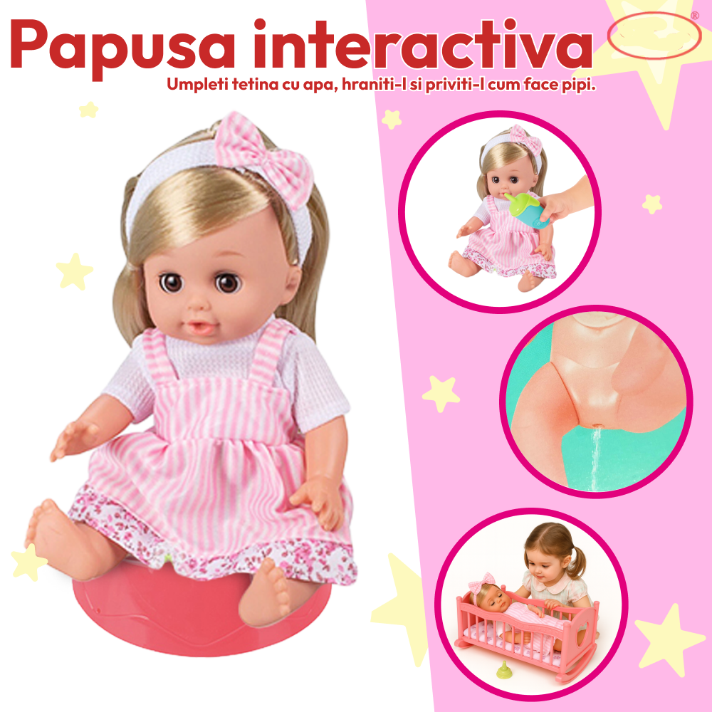 - 1 papusa interactiva cu 12 sunete ,inchide si deschide ochii