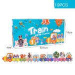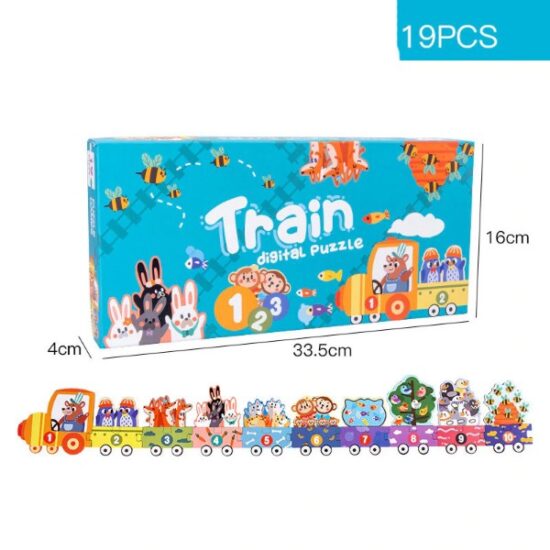 - puzzle tren digital cu 19 piese care formeaza un tren numerotat cu cifre si sigur imagini cu diferite animalute incarcate in trenulet