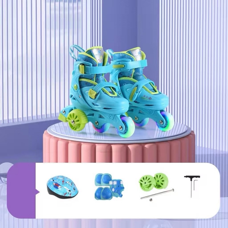 Caracteristici Set Role reglabile Bleu 2in1 cu Lumini Protectii Roti ajutatoare Frana