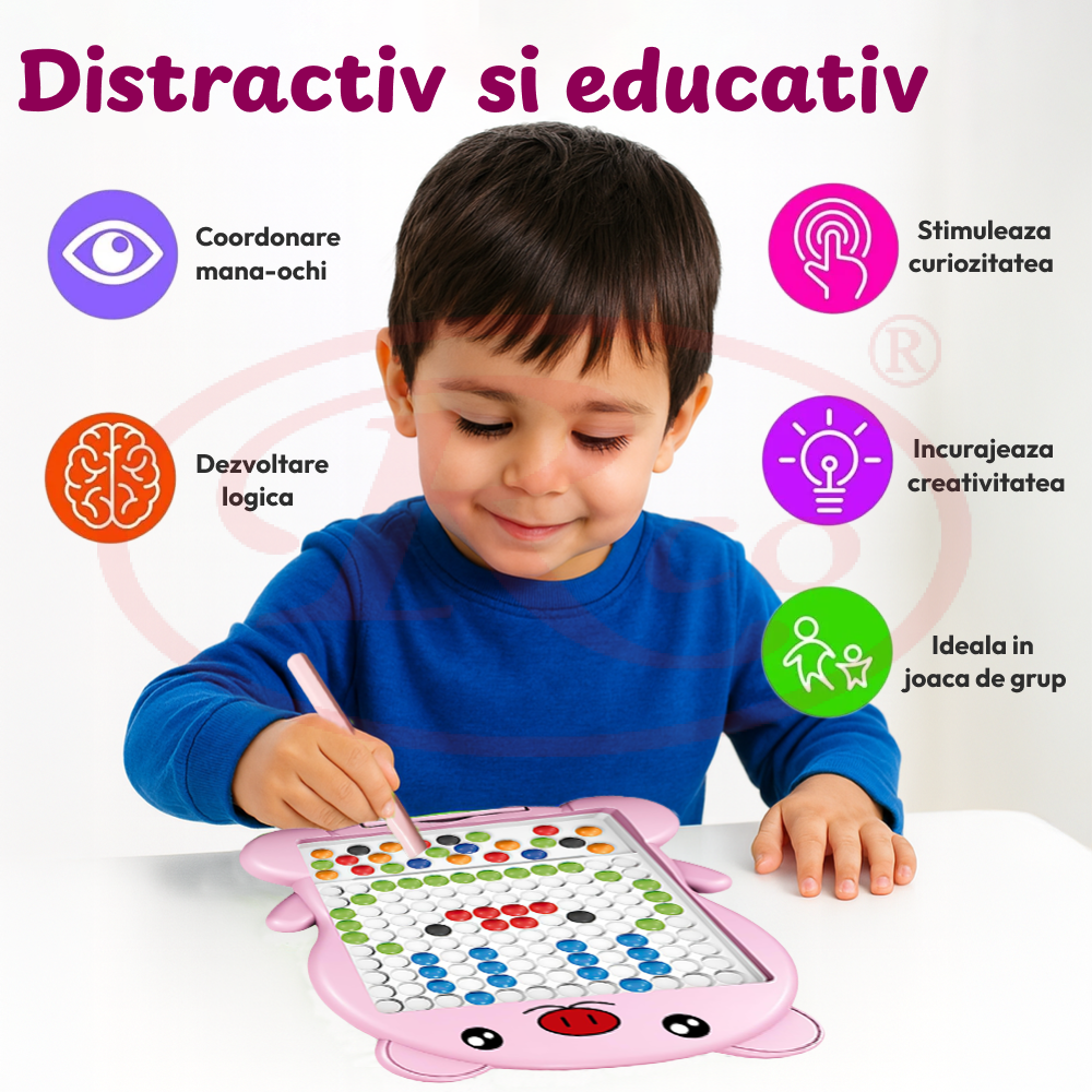 Tabla sub forma de purcelusul roz este special pentru copiii care vor sa-si exprime imaginatia artistica cu pixul magnet. Copii isi exercita atentia, imaginatia si capacitatea de control manual. Copiii pot folosi stiloul pentru a plasa margelele colorate de magnet in pozitiile corespunzatoare, urmand modelele.