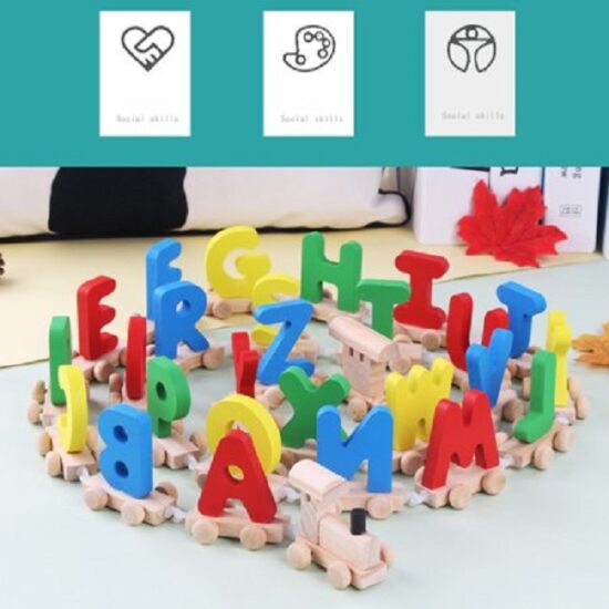 • tren din lemn cu 26 de vagoane cu litere de la A la Z,baza vagoanelor fiin din lemn natur ,iar incarcatura literele sunt colorate diferit