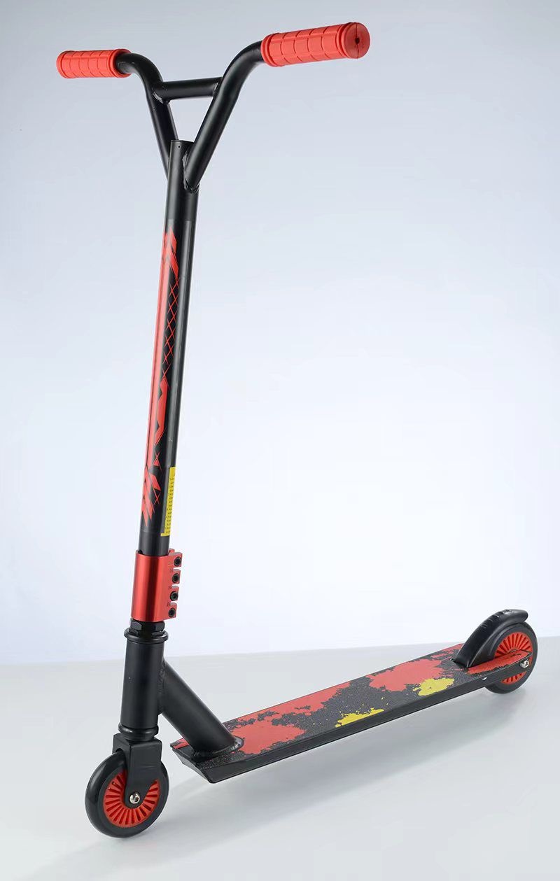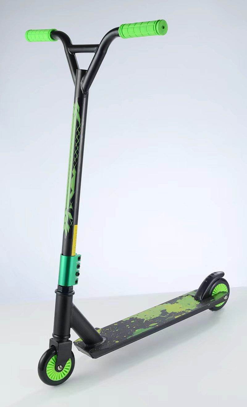 Trotineta Freestyle Stunt este recomandata copiilor cu varsta de peste 10 ani. Rapida si sigura,este dotata cu roti din silicon,cadru rezistent din aluminiu si manere confortabile. Ghidon special in forma de Y,roti mai late 100 mm,placa ALUMINIU ultra-puternica,frana cu mangan. Furca in Y foarte rezistenta este fabricata din otel carbon robust, armat. Combinatia dintre aceste doua materiale,otel si aluminiu confera scuterului o rigiditate neobisnuita si durabilitate,mentinand in acelasi timp o greutate foarte mica. Pentru stabilitate si agilitate maxima,trotineta Freestyle Stunt este echipata cu roti mai late cu un diametru de 100 mm din cauciuc poliuretanic flexibil (PUC). Impreuna cu rulmentii rapizi ABEC 7 cu miez de carbon,garanteaza o plimbare rapida. Echiparea nu trece cu vederea frana speciala durabila din aliaj de mangan,manerele din maner antiderapant confortabile.
