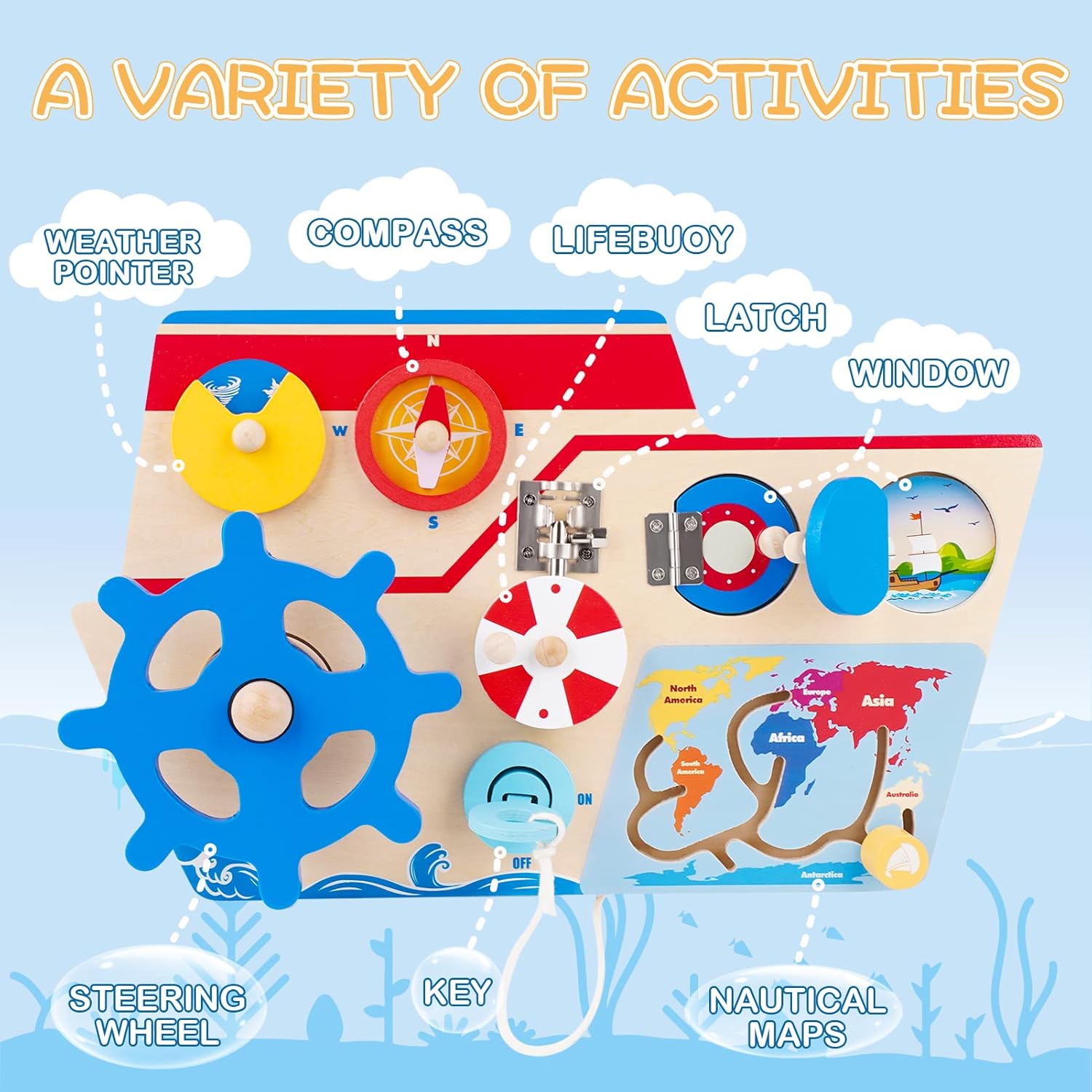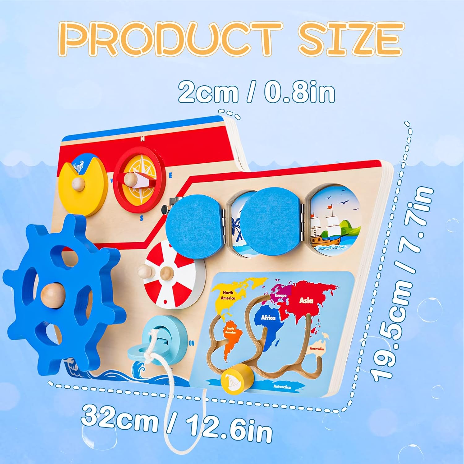 Caracteristici Vaporasul Montessori Busy Placa lemn cu Incuietori Volan Busola :
